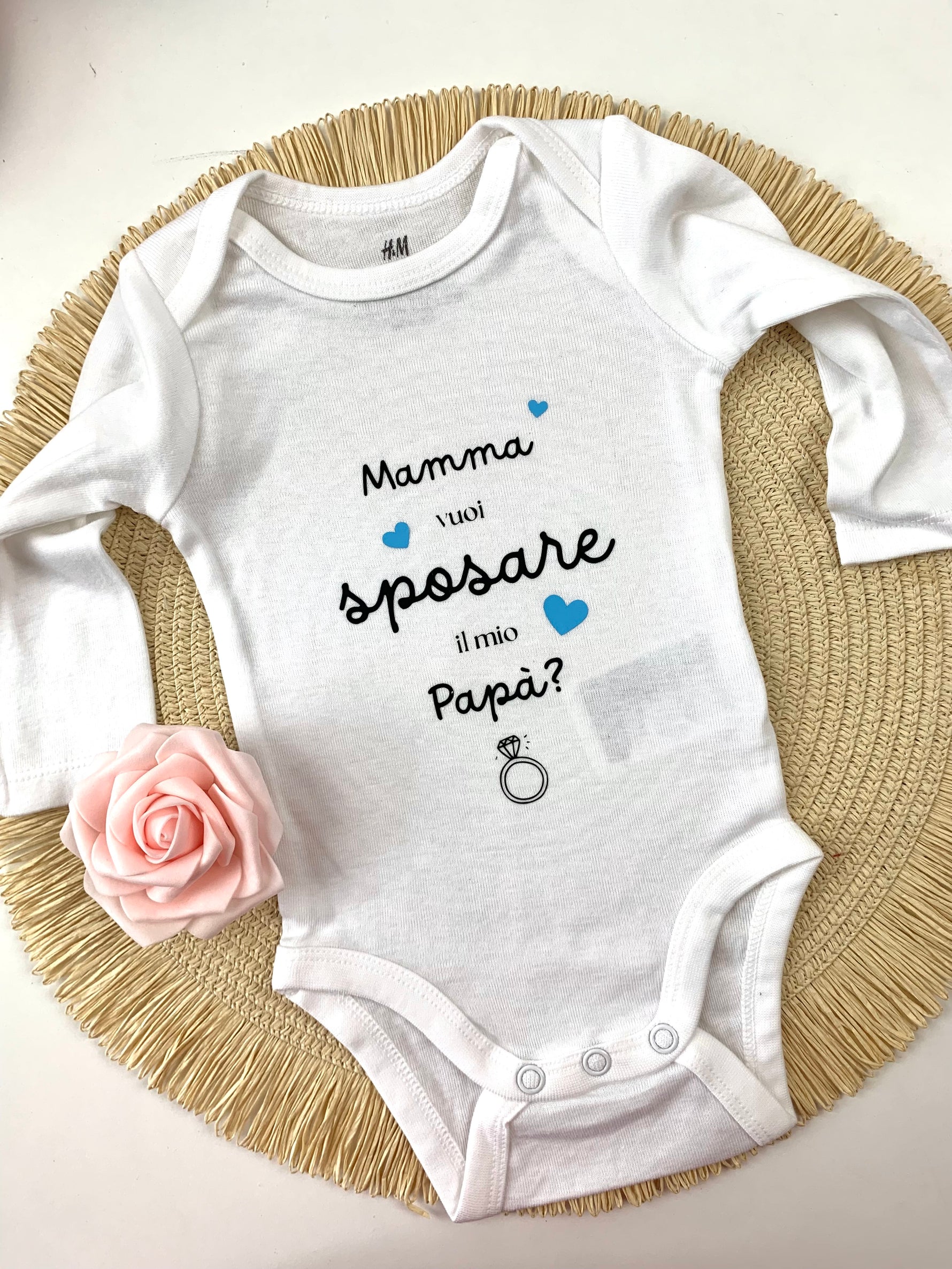 • Personalizzazione del messaggio: Il body può essere stampato con la frase “Mamma, vuoi sposare il papà?” o con un messaggio simile, aggiungendo un tocco personale all’annuncio.