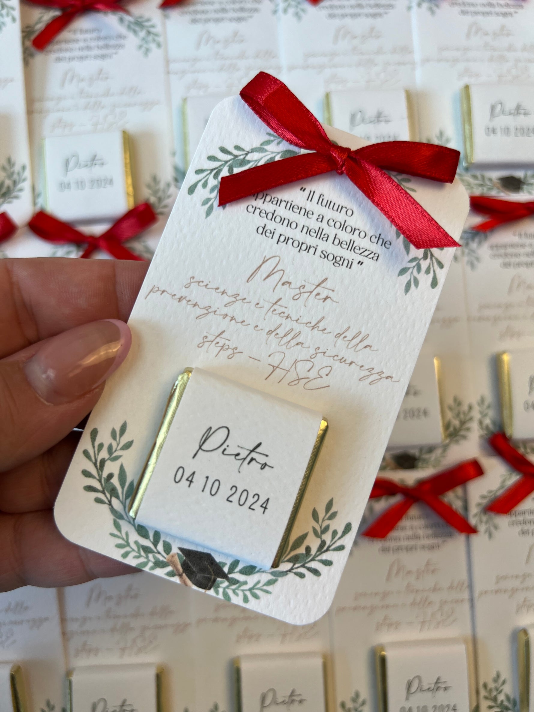 Perfetta come segnaposto o piccola bomboniera, questa card è un dettaglio prezioso che saprà stupire i tuoi ospiti. Al suo interno, troverai un delizioso cioccolatino artigianale, incastonato con cura, per un piccolo gesto di gratitudine che lascia un sapore indimenticabile.