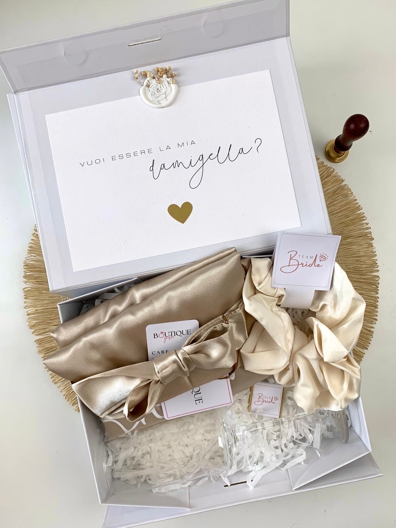 Il biglietto, con la frase “Vuoi essere la mia damigella?”, aggiunge un tocco personale e affettuoso, creando un momento di sorpresa e gioia per chi lo riceve. Ogni elemento della box è pensato per esprimere eleganza e affetto, trasformando una semplice domanda in un ricordo da custodire per sempre.