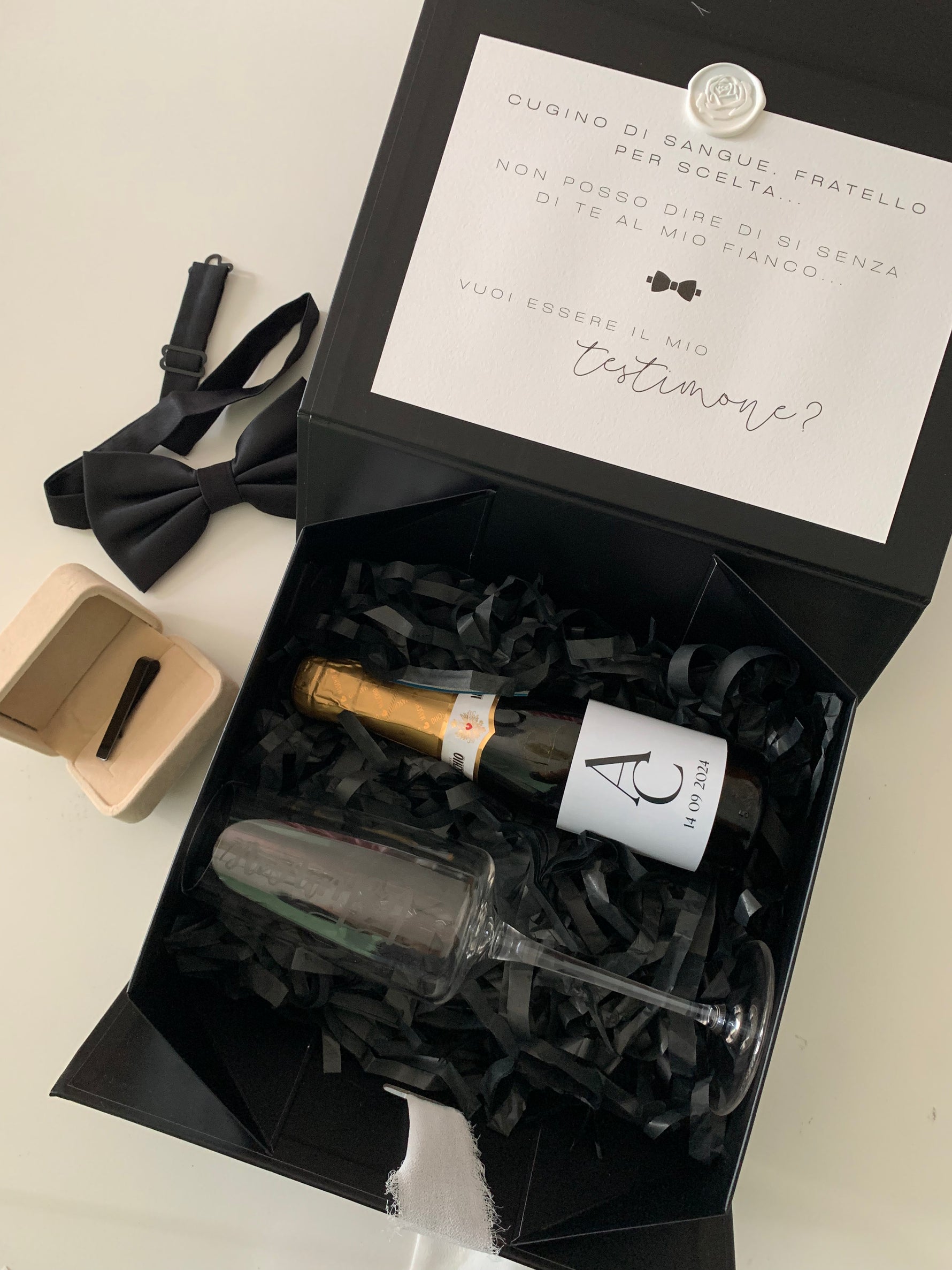 - frase interna a scelta: stampata su card in carta martellata impreziosita da timbro in ceralacca. A scelta possibilità di aggiungere foglia oro al timbro.