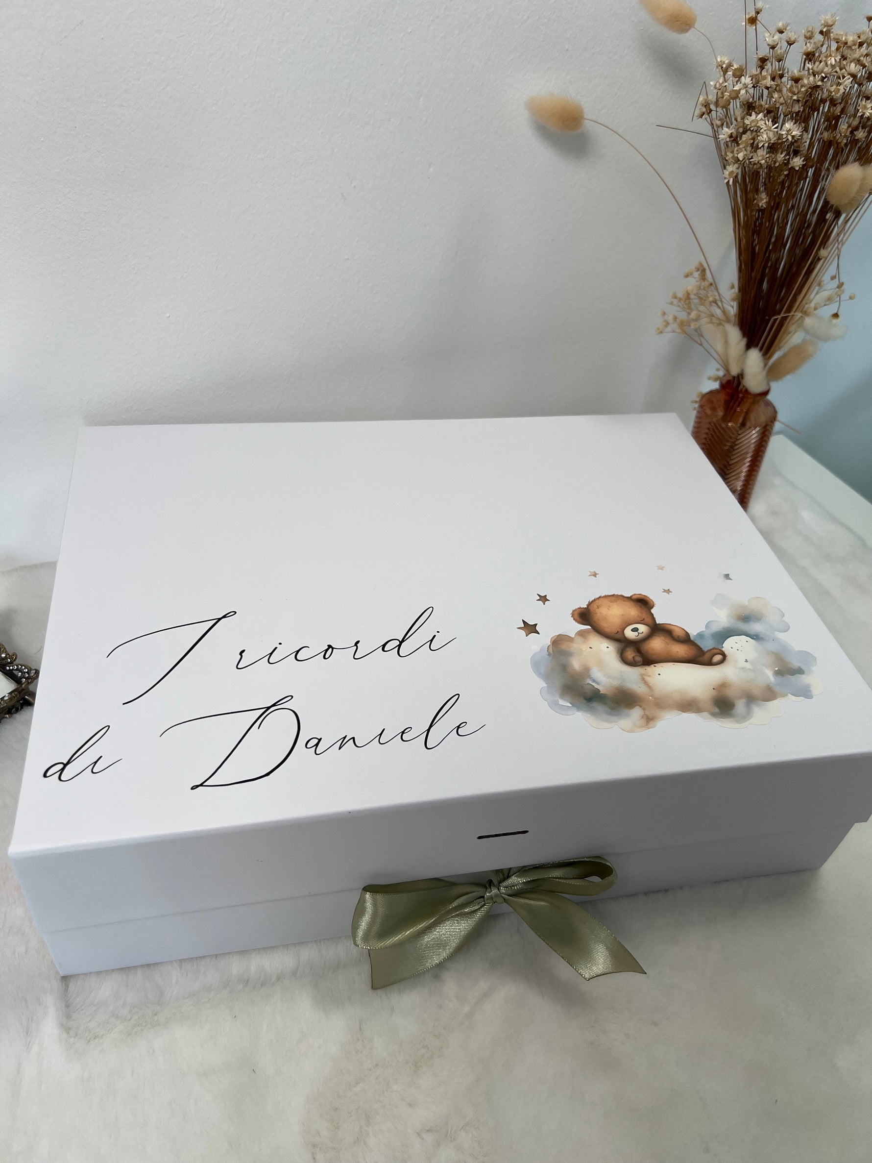 Prezzo unitario perCelebra l’inizio di una nuova vita con la Box Ricordi, un dono speciale pensato per raccogliere e custodire i momenti più preziosi della crescita di un bambino. Dalla prima ecografia ai suoi primi passi, dalle letterine ai disegni più belli, ogni dettaglio troverà il suo posto in questa scatola unica, personalizzabile con il nome e una dedica speciale.