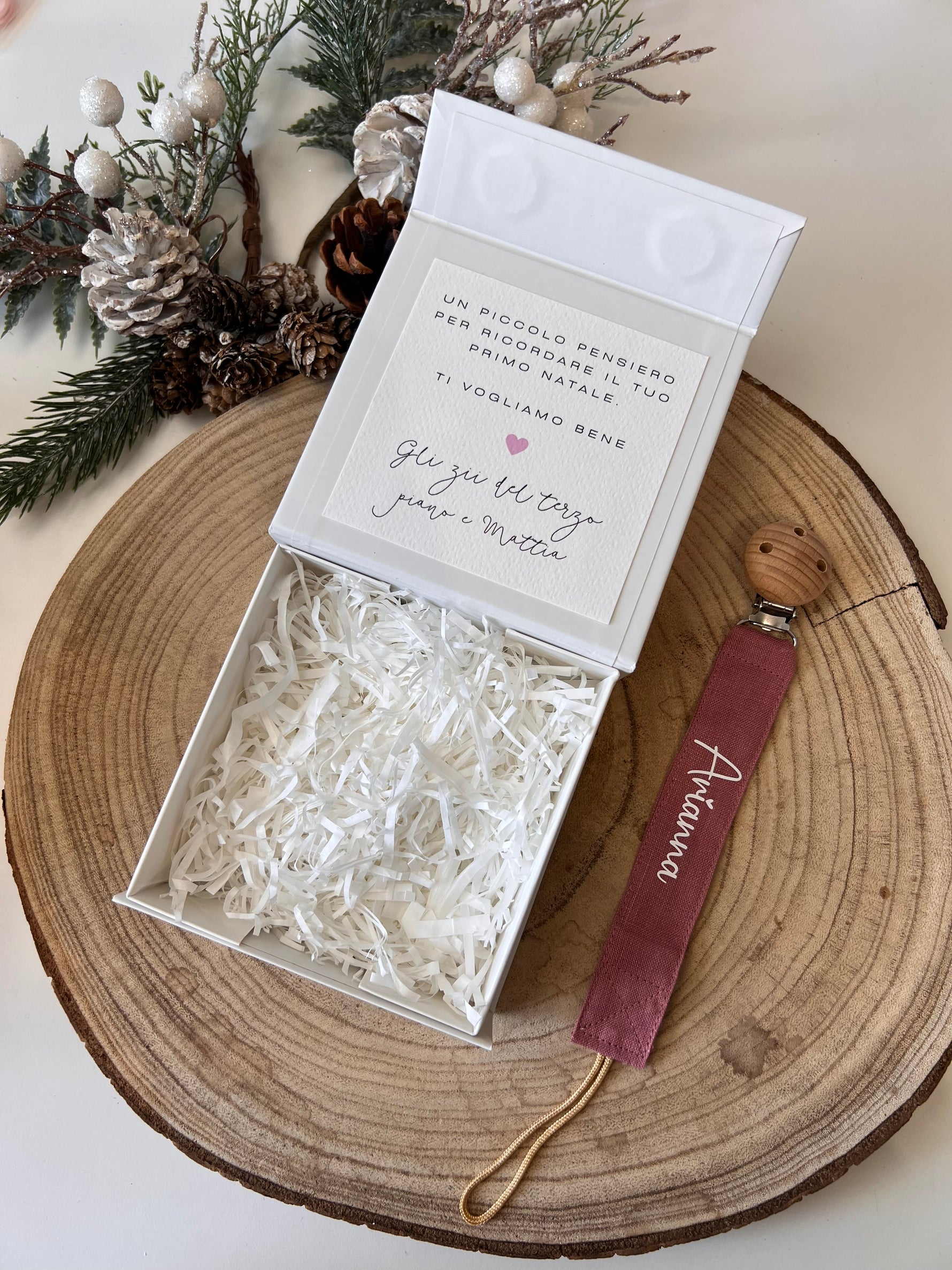 Prezzo unitario perLa mini box con catenella porta ciuccio è un pensiero delicato e pratico, ideale come regalo per una nascita o come piccolo gesto d’affetto. Questa confezione include: