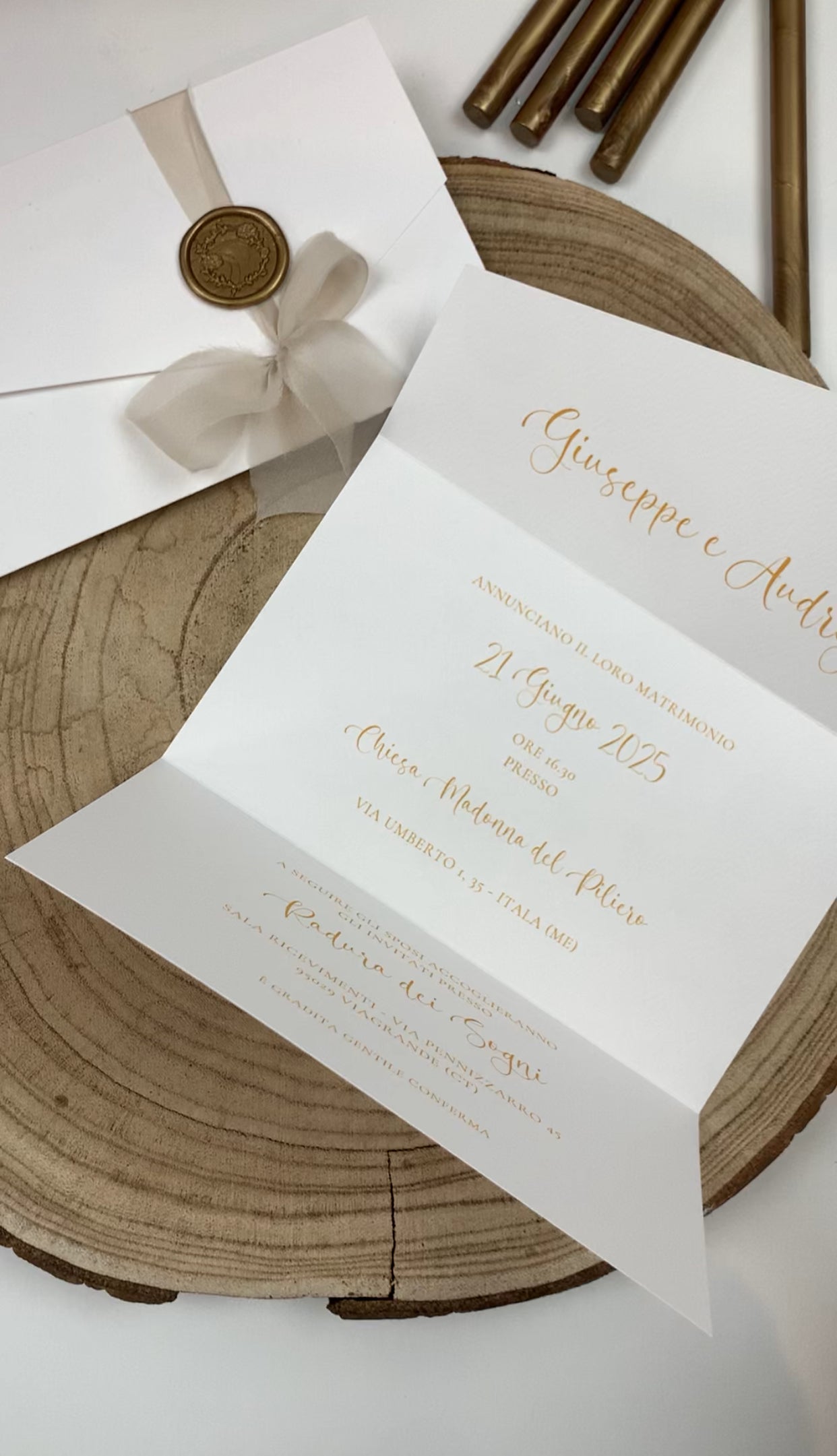 Stampata direttamente sulla busta, offre un tocco di stile unico, completato dalla chiusura a scelta tra un romantico nastro chiffon o un elegante timbro in ceralacca.