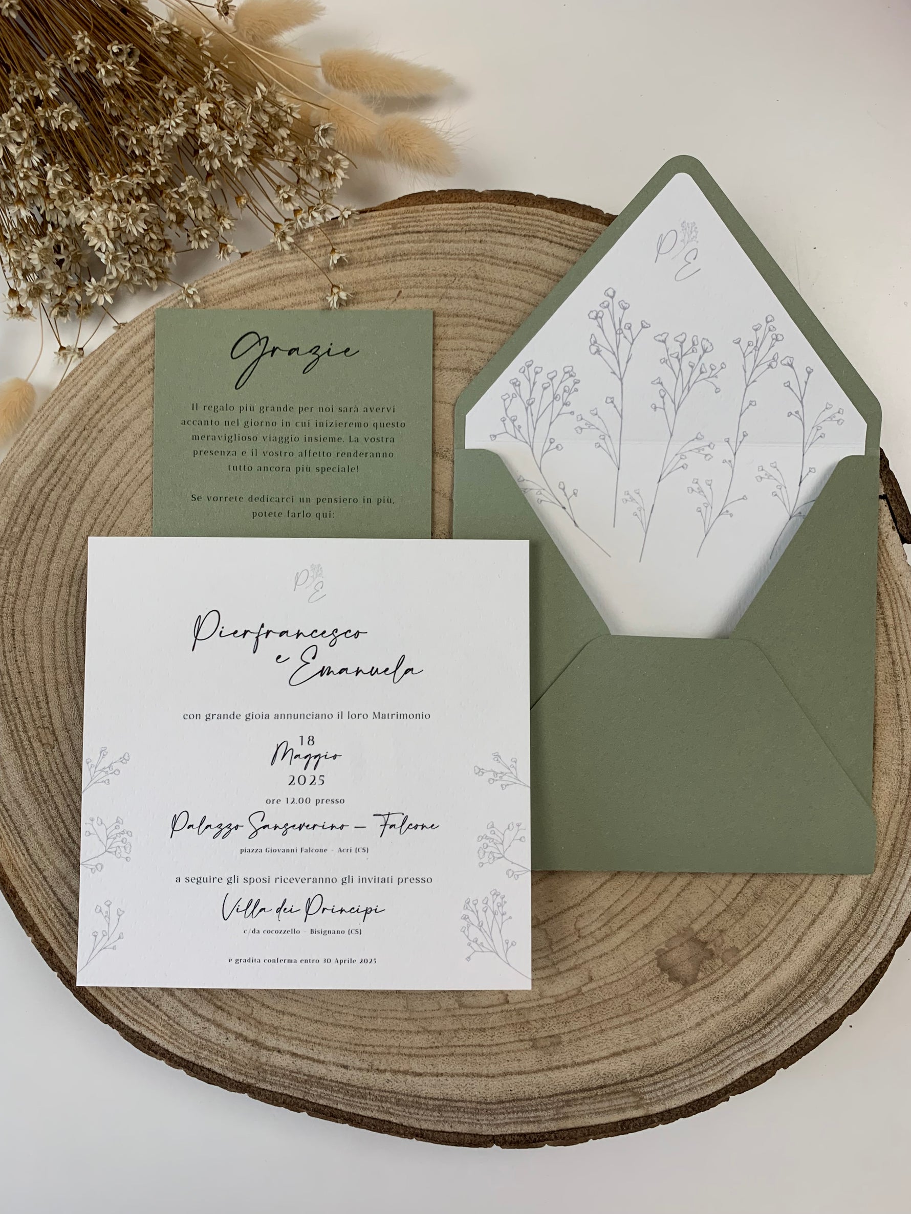 La busta quadrata nella tonalità verde salvia incornicia con armonia la grafica eterea, creando un equilibrio tra modernità e romanticismo. "Verde Mousse" è la scelta ideale per chi cerca un invito dal design esclusivo, capace di trasmettere dolcezza e classe in un’unica soluzione.