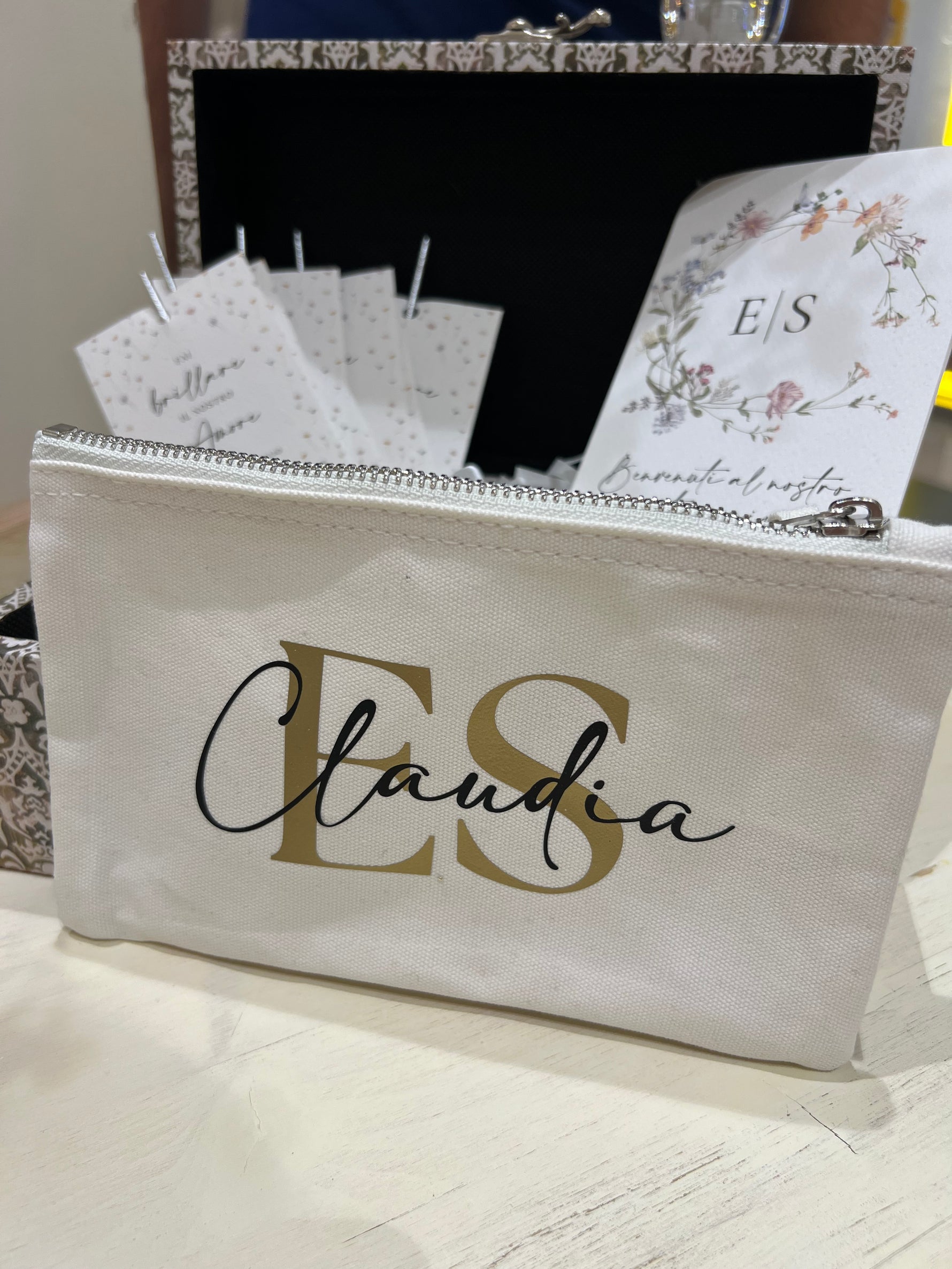 Prezzo unitario perSe non ami la carta, questa pochette per la tua wedding bag fà al caso tuo. Personalizzabile a piacimento, all’interno può contenere fino a 4/5 gadget per i tuoi ospiti.